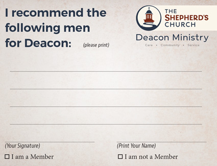 Nominations for the office of Deacon will be accepted starting January 15 through February 1. Nominees must be members of The Shepherd’s Church who possess the qualifications described in 1 Timothy 3:8-12.